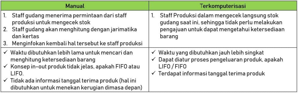 Disaat bagian produksi menerima order dari Sales, sudah pasti harus adanya pengecekan Stok / Ketersediaan barang digudang. Setelah proses pengecekan dilakukan, maka dimulailah Proses Pengadaan Barang sampai pada Mekanisme Pembayaran.