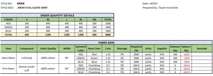 Bill of Material sangat penting untuk memesan kain dan semua trim. Karena dalam satu lembar, anda akan mendapatkan semua detail gaya tertentu. Bahkan, belakangan ini semua pemesanan kain dan trim akan dilakukan dengan menggunakan software ERP secara khusus. Namun sebelum itu, jika anda ingin membuat BOM secara manual terlebih dahulu dalam format excel, caranya pun akan sangat mudah.
