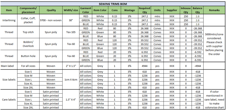 Juga, perlu konsumsi semua trim, label, dan aksesori termasuk konsumsi benang bordir jika gaya memiliki bordir.