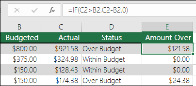 - =IF(C2>B2,”Over Budget”,”Within Budget”)